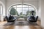 En dörr leder ut till entréhallen efter fullbordat varv. Till vänster tar ljusgrå värmeklinker över i en ljus lounge med drag av glasveranda i villans ena hörn. Här finns dubbla glasdörrar och tre spröjsade glaspartier i två väderstreck. Dörrarna leder ut till baksidans stenlagda terrassytor inramade av vitputsad mur och grönska. Loungens inslag av liggande vit panel ger karaktär åt det trevliga rummet.