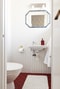 Gästtoalett renoverat 2009. Golv: klinkers. Väggar: kakel. Utrustning: toalett och tvättställ.