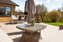 Uppvuxen trädgårdstomt med gräsmatta, häckar, träd och planteringar.
