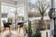 När vi tar steget in i allrummet öppnar bostaden upp sig ordentligt. De stora fönsterpartierna skapar ett fantastiskt ljusinsläpp och tillsammans med den genomgående fiskbensparketten får vi en varm och elegant atmosfär. Här finns gott om plats för både soffgrupp och matbord, och rummets form gör det lätt att möblera efter behov och livsstil. Det är en social och trivsam yta där vi gärna dröjer oss kvar.
