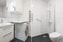 Rakt fram ligger rymligt och fräscht badrum som är kombinerad med tvätt. Badrummet är helkaklat med snygg grå klinkers som matchar fint ihop med det vita kaklet på väggarna. Vi har kombinerat tvättmaskin med torktumlare som står under praktisk arbetsbänk för klädvård och överskåp till smart förvaring.