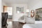 Kök från IKEA renoverat 2018. Golv: laminat. Köksluckor: Gråa. Bänkskiva: mörk kompositsten. Utrustning: (spishäll, 2018), fläkt (2018), kyl-fullhöjd (2018), frys-fullhöjd (2018) och integrerad diskmaskin (2018).