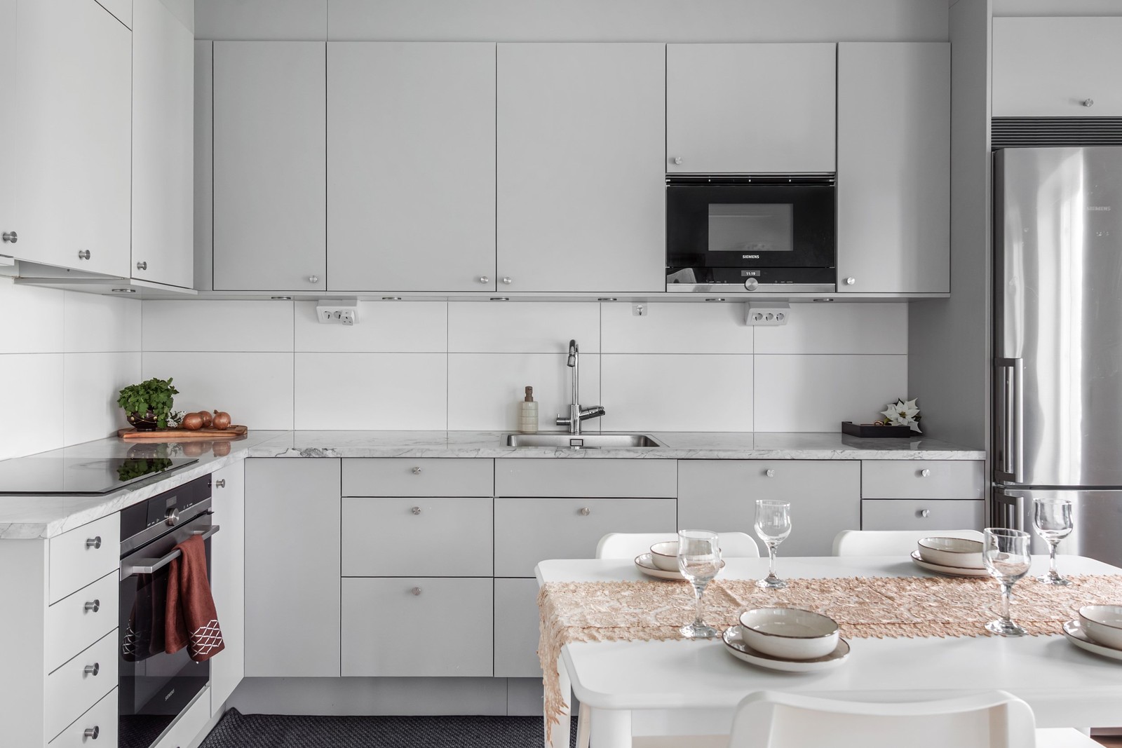 Vardagsrummet speglas i ett naturligt ljus tack vare fönster i två väderstreck och samspelar elegant med köket i en öppen och social planlösning. Här skapas en självklar plats för både umgänge och avkoppling. Köket är inrett i stilrena grå toner med exklusiva materialval och stenskiva, fullt utrustat med moderna vitvaror såsom diskmaskin och generösa förvaringsmöjligheter. Från köket nås bostadens balkong, en trivsam förlängning av hemmet med plats för mindre möblemang, perfekt för morgonkaffet eller sensommarkvällar!