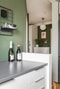 Längre in i bostaden återfinns det smakfullt utrustade köket, en social och funktionell yta där varje detalj är genomtänkt. De vita skåpsluckorna och det matchande stänkskyddet harmonierar vackert med den grå laminatbänkskivan. Köket är utrustat med spishäll, ugn, kombinerad kyl/frys och köksfläkt.