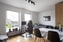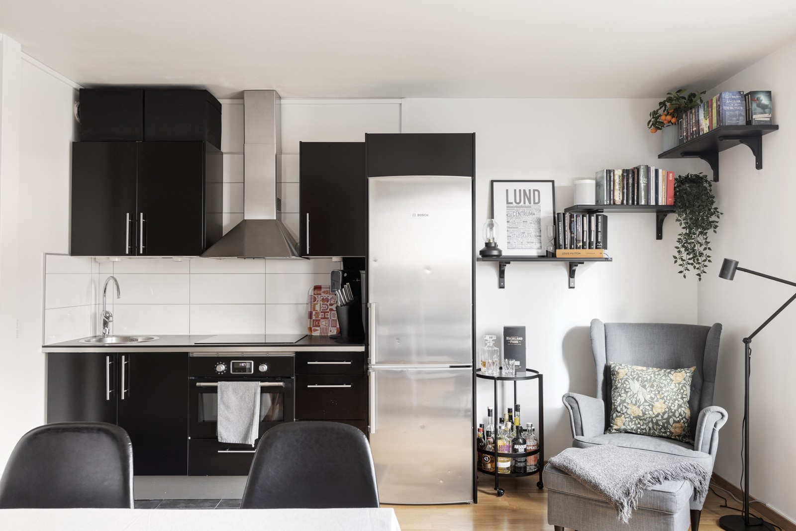 Vidare från hallen når vi bostadens allrum. På vänster sida ligger kök från 2010 som består av svarta luckor, vita stora kakelplattor och mestadels utrustning med fabrikat IKEA. Kombinerad kyl och frys i rostfritt utförande är från Bosch. Induktionshäll från IKEA samt kombinerad ugn/micro.