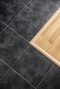Direkt till vänster finner vi bostadens helkaklade badrum från 2007. Ljusa materialval ger en trivsam känsla. De vita kvadratiska kakelplattorna bryts av mot grått kakel i en vågrät linje. Det grå kaklet följs sedan upp av klinker i samma kulör. Badrummet är utrustat med tvättställ, spegelskåp, WC, dusch och handdukstork.