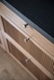 Köket är både praktiskt och socialt, med gott om arbetsytor och förvaring. Den mörka bänkskivan bryter elegant mot klassiska ekfronter och skapar en tidlös känsla. Här finns plats för matbord för minst fyra personer, och tack vare de generösa fönstren flödar ljuset in och bjuder på en grönskande utsikt mot föreningens lummiga gård.