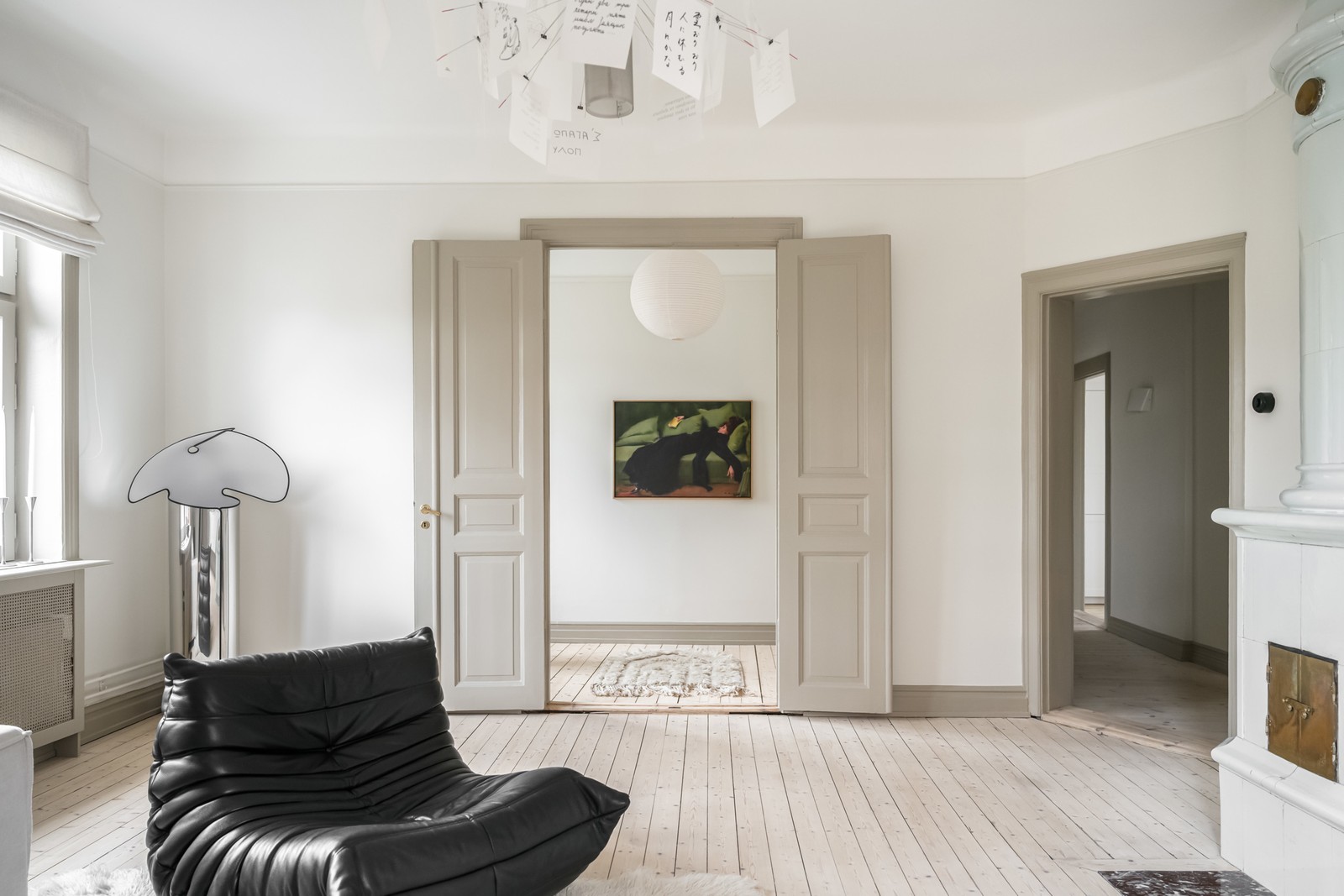 Våningen erbjuder ett fantastiskt ljusinsläpp, med djupa fönsternischer som släpper in rikligt med naturligt ljus. Den höga takhöjden förstärker känslan av rymd och öppenhet. Här finner ni två vackra fungerande kakelugnar, stuckaturer, brädgolv och andra tidstypiska detaljer som skapar en varm och inbjudande atmosfär.