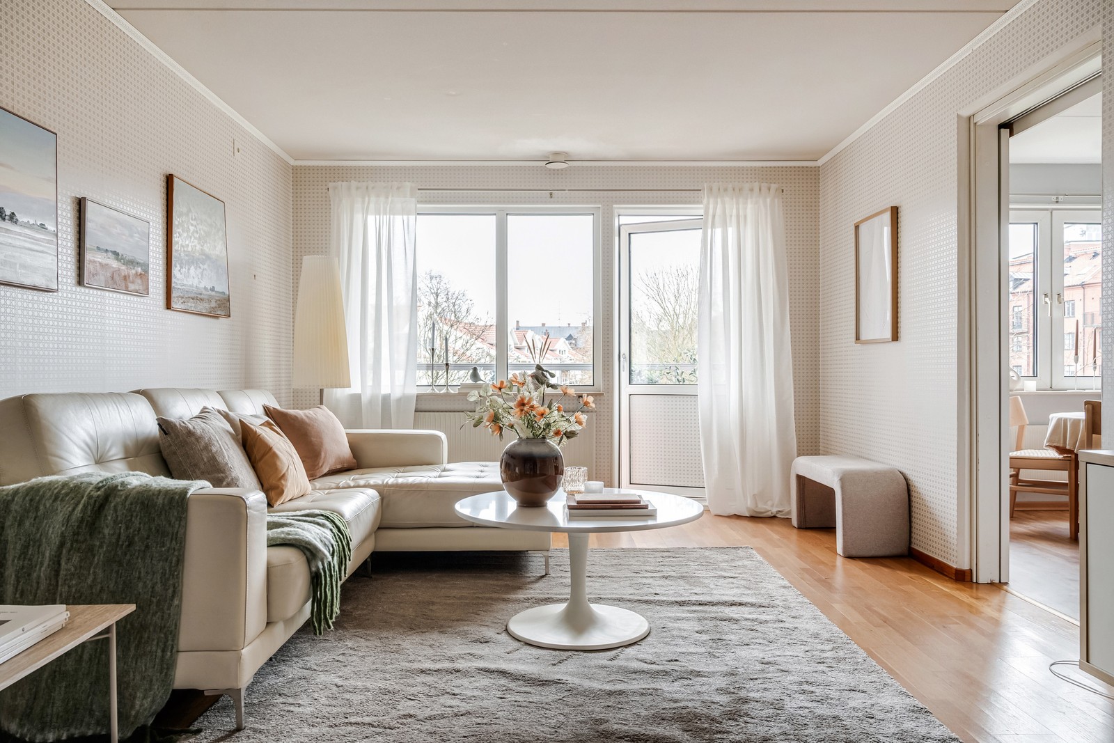 När du kliver in i lägenheten möts du av en välkomnande och rymlig hall. Till vänster öppnar det ljusa och generösa vardagsrummet upp sig perfekt planerat för både en mysig soffgrupp och en trevlig matplats. Härifrån når du även den härliga balkongen i västerläge med utsikt över den stillsamma innergården, en idealisk plats för avkoppling efter dagens slut. Till höger finner du köket med utrymme för en matgrupp. Intill köket ligger badrummet, utrustat med både tvättmaskin och torktumlare för bästa bekvämlighet. Precis bredvid finns även den smart planerade sovalkoven som rymmer en större säng och skapar en avskild och rofylld sovplats.