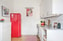 Kliv upp genom trappan till andra våningen via den lummiga innergården och vidare till lägenheten. Direkt genom ytterdörren finns plats för hallmöblemang om så önskas, och i utrymmet möts du direkt av det trivsamma köket med plats för matplats. Köket är fräscht med vita skåpsluckor och bänkskiva i sten. Stänkskyddet består av vitt kakel och köket innehåller spis/ugn, fläkt (år 2025), kyl/frys och diskho i rund form. Köket har högt i tak och har ett stort fönsterparti som vetter mot föreningens lummiga innergård i västerläge. Väggarna är vitmålade och golvet pryds av charmigt brädgolv som är återkommande i resterande delar av lägenheten.
