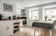 Stilrent renoverat kök (2017) med vita luckor i kombination med ljusgrå kakel ovan bänkskiva svart laminat som bryter av snyggt mot det vita. Bra skåpsförvaring och goda arbetsytor. Plats för matbord till 4-6 personer.