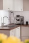 Köket är modernt och elegant med stilren inredning från IKEA från 2022. De ljusa släta luckorna kombineras med gott om arbetsytor och en komplett maskinpark med integrerad kyl och frys, diskmaskin, inbyggd mikro, inbyggd ugn och induktionshäll. Spisen byttes dessutom ut i april 2026 efter att en spricka uppstått i den tidigare induktionshällen.