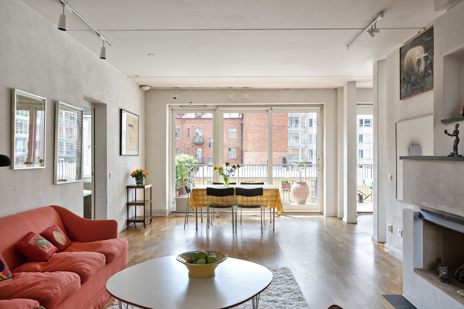 Genomgående 3,5:a med hiss, balkong i väster, garageplats och utsikt mot Ribbingska huset.