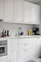 med schackrutigt golv av linoleumplattor i gråa nyanser och ljusgrå väggar. Högt i tak och höga golvsocklar. Ljus köksinredning med ovan bänkskivan i vit marmormönstrad stenkomposit. Här finns diskmaskin, induktionshäll, fläkt, kyl/frys (2015) samt generös matplats för ett flertal personer. Köket är helt nytt från 2017 samt väggar och tak målades.
