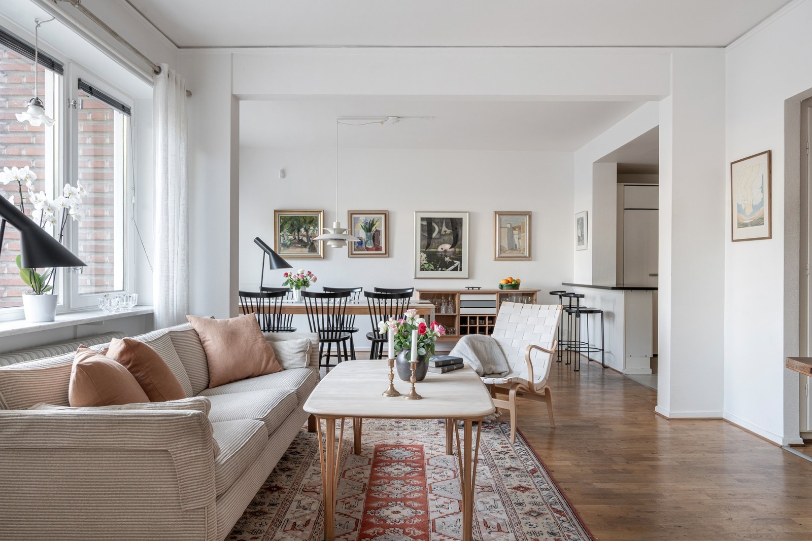 Vardagsrummet är rymligt och ljust med parkettgolv och målade väggar. De stora fönsterpartierna bjuder in ljuset och ger fri utsikt över Botaniska Trädgårdens grönska. I anslutning till vardagsrummet ligger ett kontor/tv-rum som även går att använda som sovrum om så skulle önskas.