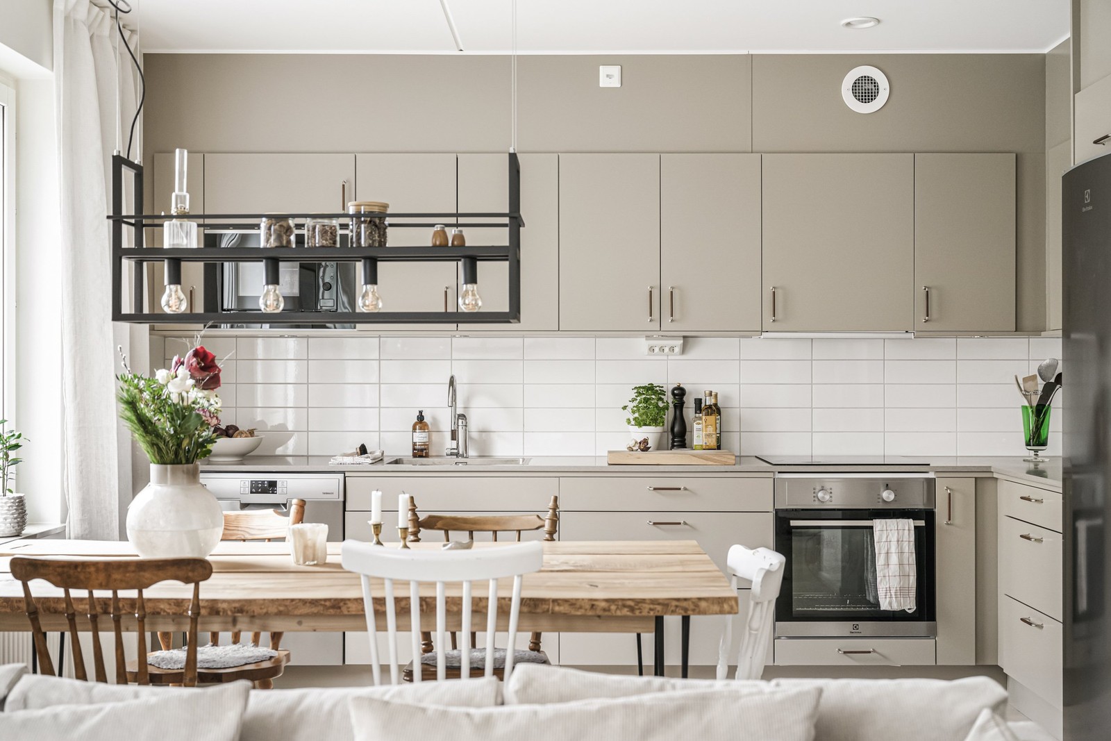 Här möts du av en ljus och trivsam bostad med en öppen planlösning där kök och vardagsrum samspelar på ett naturligt sätt. Köket från Vedum är generöst tilltaget för att vara en tvåa och utformat i vinkel, vilket ger gott om både arbetsyta och förvaring. Här finns alla bekvämligheter man förväntar sig, såsom diskmaskin, induktionshäll, mikro och ugn från Electrolux, samt tillval som dubbel kyl och frys. Bänkskivan i portugisisk kalksten och beslag med läderhölje ger köket en varm och genomtänkt karaktär.