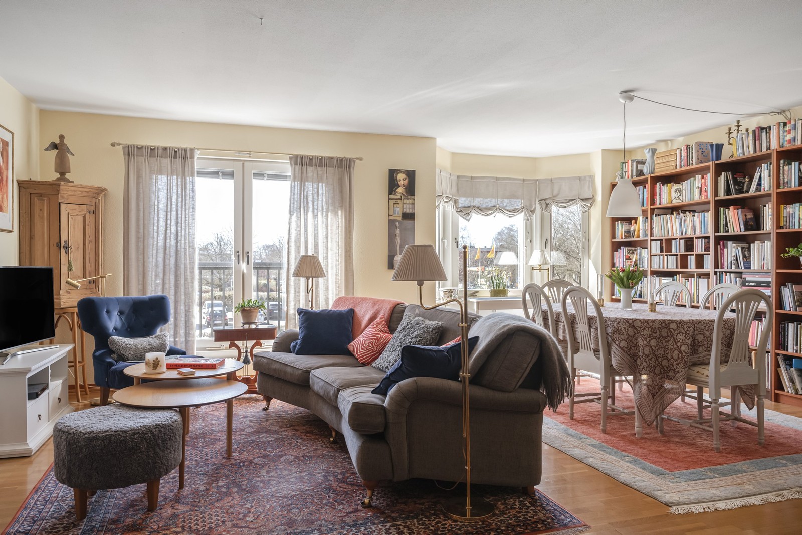 Vardagsrummet är lägenhetens hjärta. Här finns gott om plats för hela släkten och vännerna vid festliga tillfällen. Golven pryds av stavparkett i ek och väggarna är ljusa. Två generösa fönsterpartier med vidsträckt utsikt ger ett fantastiskt ljusflöde i det rymliga rummet. Det ena fönsterpartiet har stora glaspartier och fransk balkong och det andra är ett burspråk.