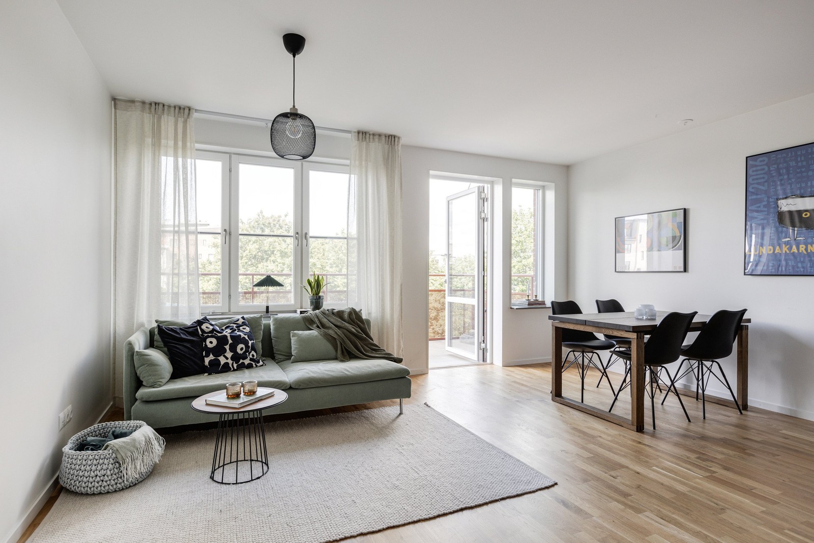 Det härliga vardagsrummet är luftigt och skänks rikligt med ljus tack vare det generösa fönsterpartiet. På golvet ligger 3-stavs ekparkett och väggarna är vitmålade. Från vardagsrummet välkomnas vi ut på den stora balkongen med en grönskande och lummig utsikt. Rummet är väl tilltaget och ger plats för både sällskaps- och tvmöblemang som skrivbord för den som önskar.