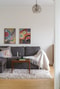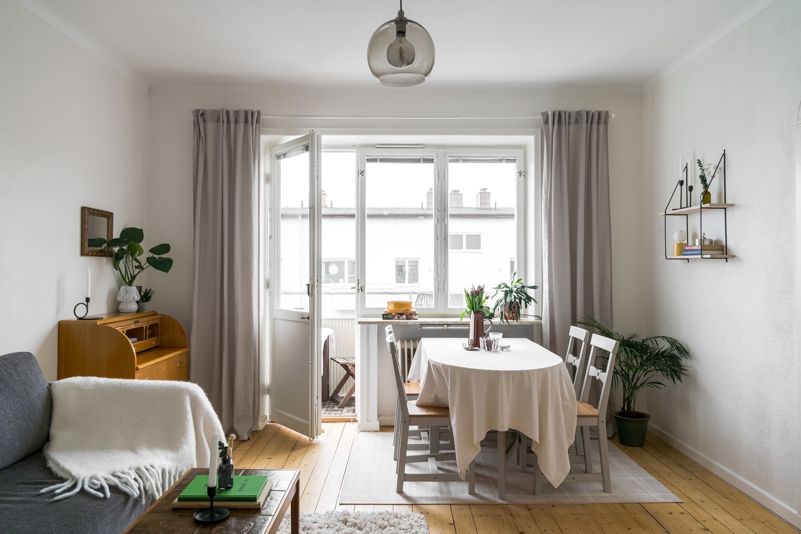 Vardagsrummet är ljust och ombonat. De vackra brädgolven är framtagna och skänker mycket charm och karaktär. Väggarna är ljusa och med ett härligt ljusinsläpp från stora fönsterpartier åt sydväst. Här finns plats för såväl soffmöblemang och matbord för trevliga middagar bland goda vänner. Utgång till balkongen i härligt solläge eftermiddag- och kväll med grönskande utsikt mot vackra Södra Esplanaden och innergården.
