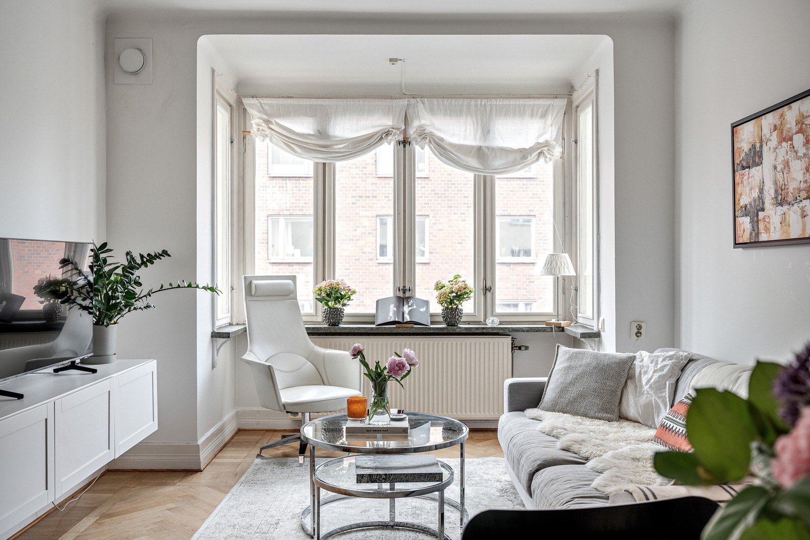 Kliv in och möts av det generösa ljusinsläppet och känslan av luftighet. Med stilfull fiskbensparkett, vackra takrosetter och ett charmigt burspråk erbjuds en tidlös karaktär med originaldetaljer som andas 30-talets elegans.