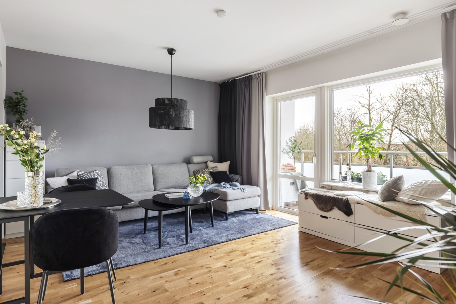 Rakt fram från hallen ligger lägenhetens hjärta, det stora vardagsrummet och köket med öppen planlösning. Här finns gott om utrymme för matplats och soffgrupp. Utsikten från tredje våningen är mycket uppskattad och skapar en känsla av rymd åt bostaden. Här finns även utgången till balkongen i söderläge med plats för utomhussoffa, bord och stolar. Här är det gott att njuta av solnedgången en varm sommarkväll.