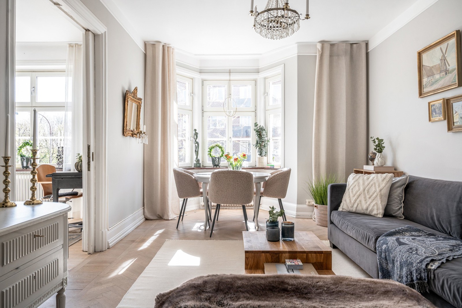 Belägen på våning 2 i en vacker fastighet uppförd 1929 möts du här av en bostad med en alldeles särskild atmosfär. Den generösa takhöjden skapar en härlig rymd, medan detaljer som takrosetter, rundade valv och det karaktäristiska runda burspråket i vardagsrummet ger hemmet en unik och klassisk prägel. Här finns en tydlig känsla av historia utan att kompromissa med dagens bekvämligheter.