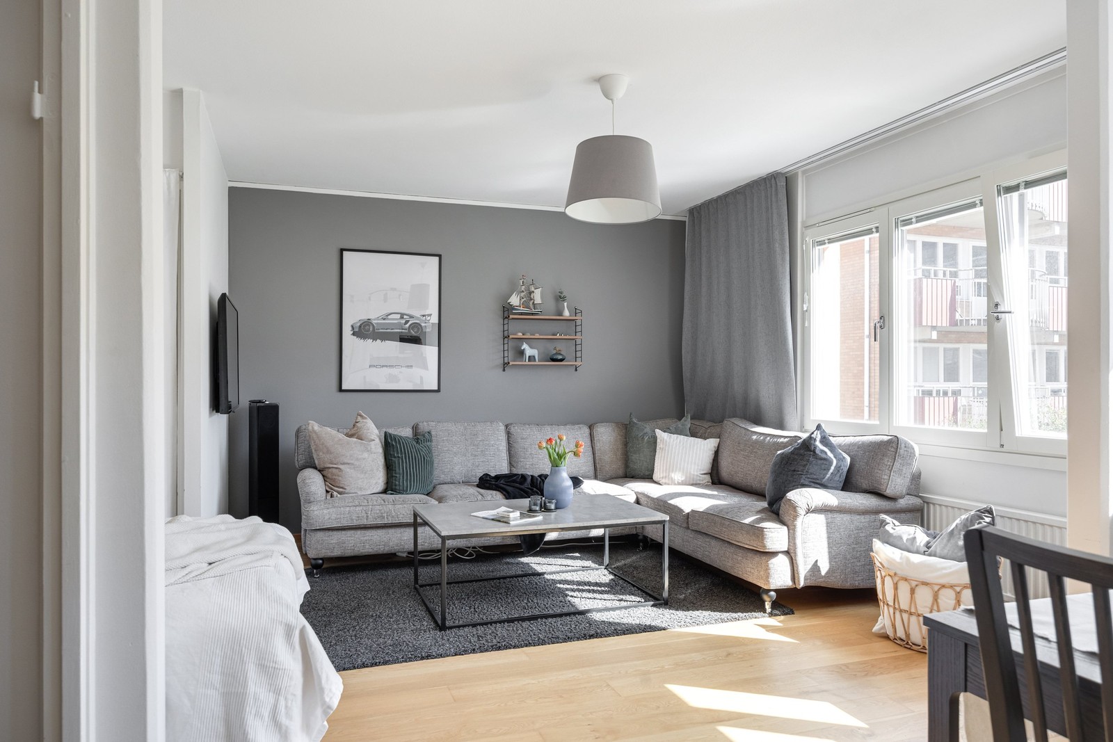 Redan i hallen möts du av en praktisk yta med goda avhängningsmöjligheter och plats för förvaring. Vidare in i bostaden öppnar sig ett luftigt allrum med ett fint ljusinsläpp från stora fönsterpartier. Rummet rymmer med lätthet både soffgrupp och matplats, vilket skapar en trivsam miljö för såväl vardag som sociala tillställningar. Den halvöppna planlösningen mot köket ger en modern känsla och bidrar till bostadens öppna och inbjudande karaktär.