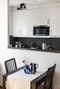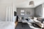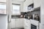 Köket är stilrent och funktionellt renoverat 2020 med vita skåpsluckor, mörk bänkskiva och matchande kakel ovan arbetsytorna. Här finns gott om förvaring samt bra arbetsytor för den matlagningsintresserade. Ett fönster ovan diskbänken släpper in rikligt med dagsljus och ger en trevlig utsikt. Köket har öppnats upp till en halvöppen planlösning vilket ger en social känsla i hela lägenheten.