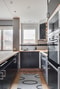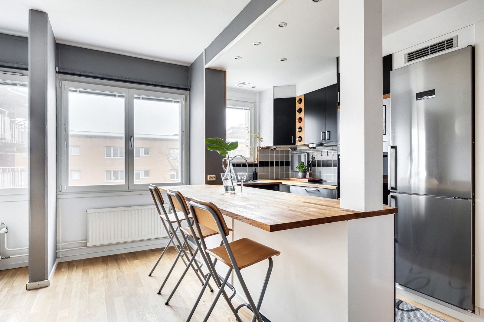 Bostaden erbjuder en inbjudande öppen planlösning mellan kök och vardagsrum, vilket skapar en rymlig och social yta med gott om ljusinsläpp från flera fönsterpartier. Köket är stilrent och funktionellt, renoverat 2010 och då målades och tapetserades även hela lägenheten. Här finns generösa arbetsytor, bra förvaring och plats för matbord vid den trevliga bardelen. Notera att säljaren informerar om att lampan i kylskåpet inte fungerar.