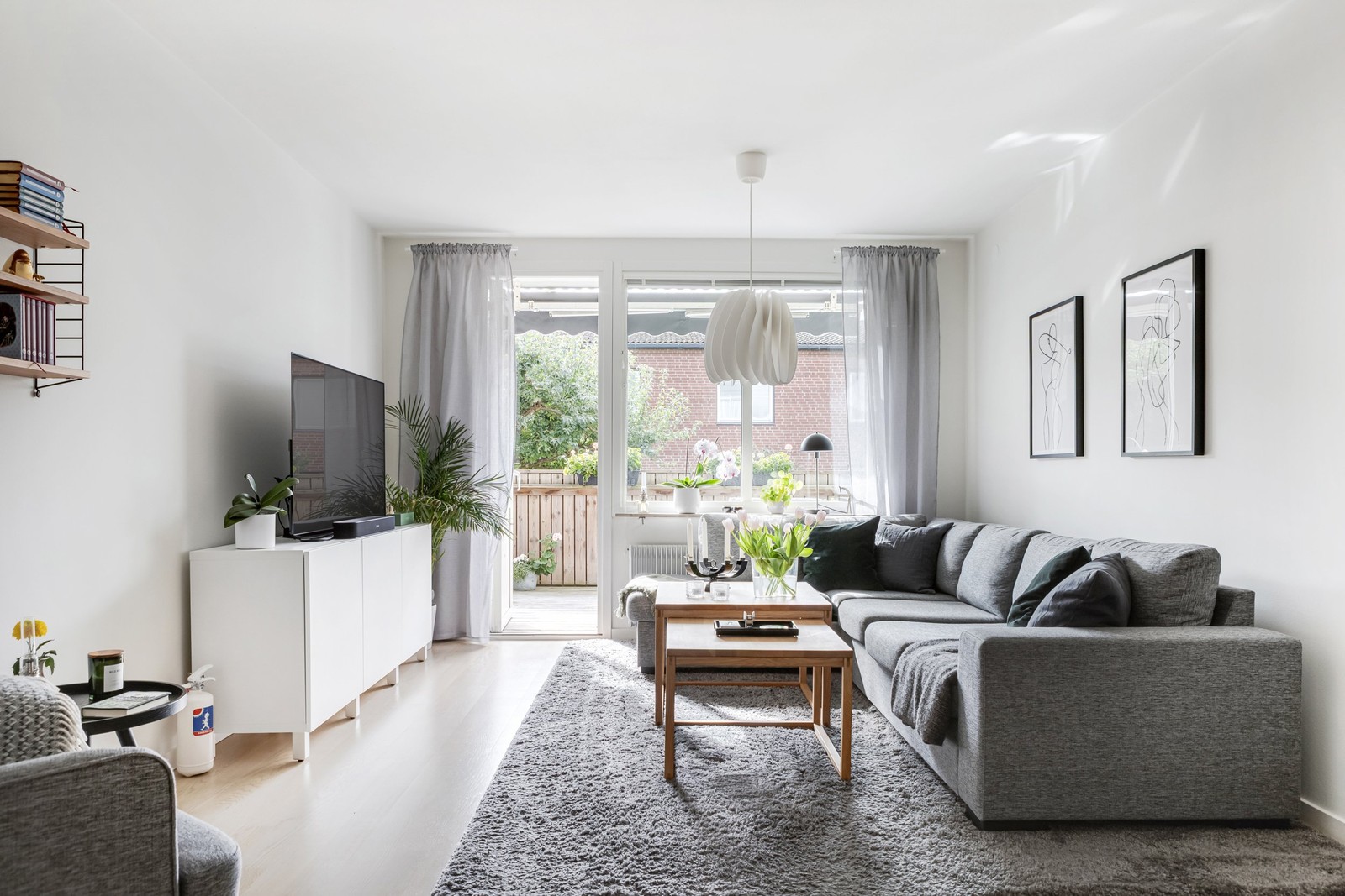 Lägenheten har en genomgående planlösning med fina ljusinsläpp från två håll och en hemtrevlig känsla som gör att bostaden upplevs större än sina kvadratmeter. Entrén välkomnar med ljusgrått klinkergolv och god plats för avhängning. I övriga delar av bostaden ligger ett ljust laminatgolv som tillsammans med de genomgående vita väggarna skapar en ljus och luftig atmosfär.