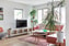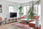Ljust vardagsrum med fönster i två väderstreck. Den öppna kontakten mot matplatsen gör rummet både luftigt och socialt, med gott om plats för soffgrupp och umgänge.