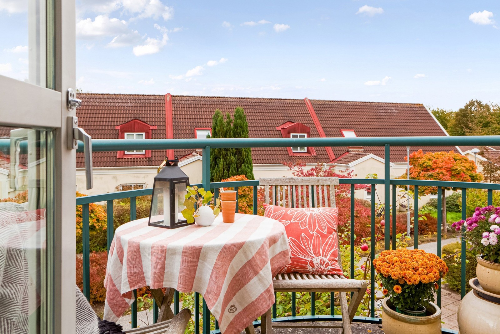 Solig balkong i söderläge med utrymme för sittgrupp och växter. Perfekt för morgonkaffet eller en lugn stund i kvällssolen. Markis finns installerad för varma dagar.