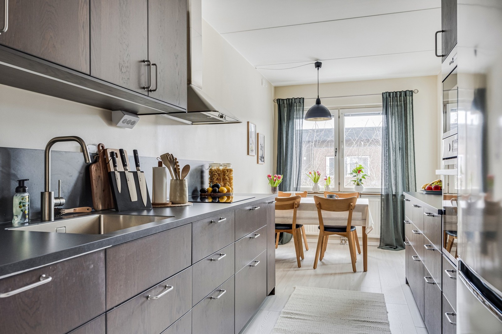 Köket renoverades 2024 och bjuder på stilrena köksluckor från SINARP, svart stenmönstrad laminatbänkskiva och fullt maskinellt utrustat med integrerad diskmaskin, induktionshäll, varmluftsugn samt mikro i rostfritt. Här finns gott om arbetsyta och förvaring samt plats för matbord vid fönster som släpper in fint dagsljus. Från köket når du även balkongen, perfekt för morgonkaffet, sommarens måltider eller en stund i friska luften.