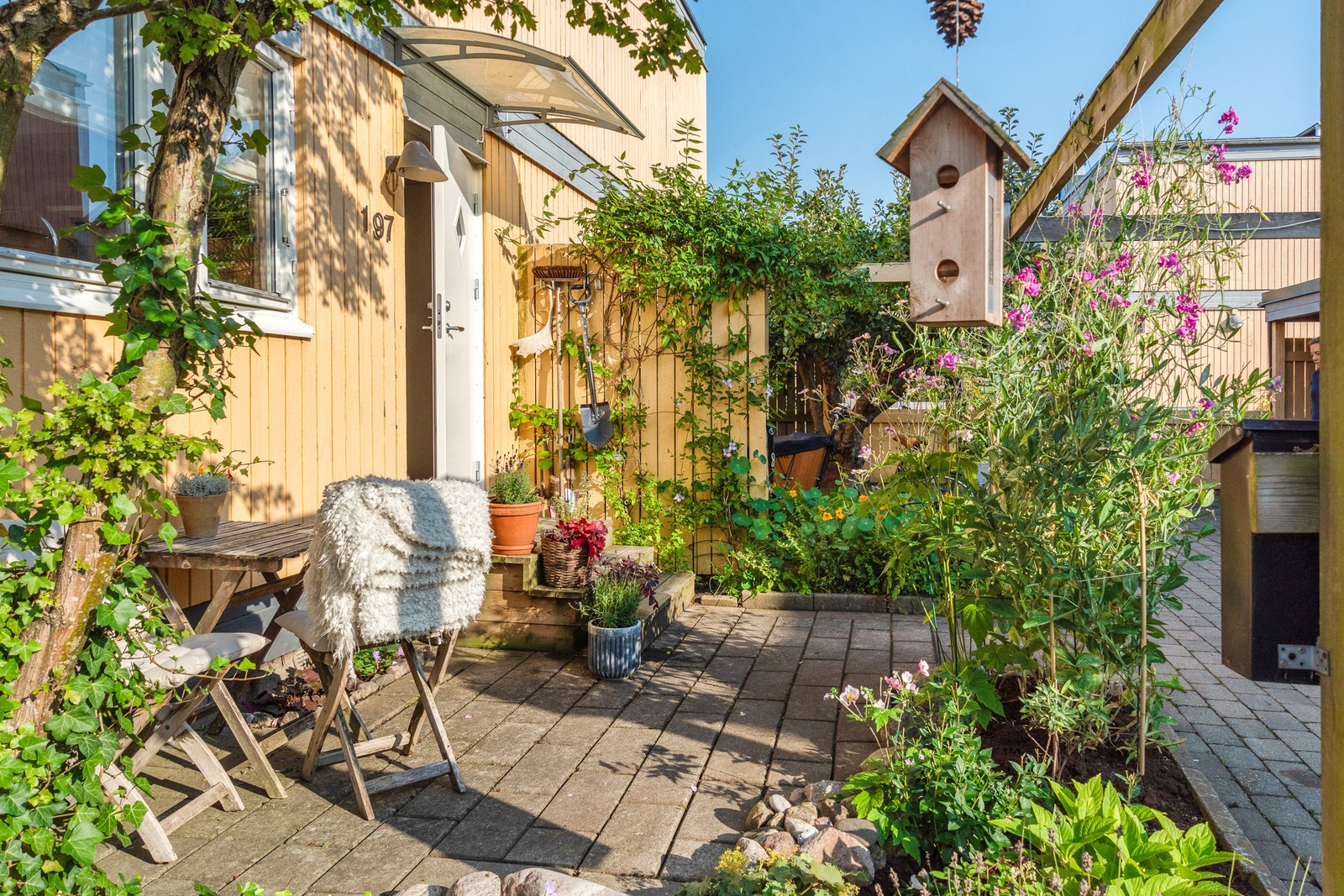 Stilfullt radhus med två uteplatser, renoverat badrum och grönskande innergård!