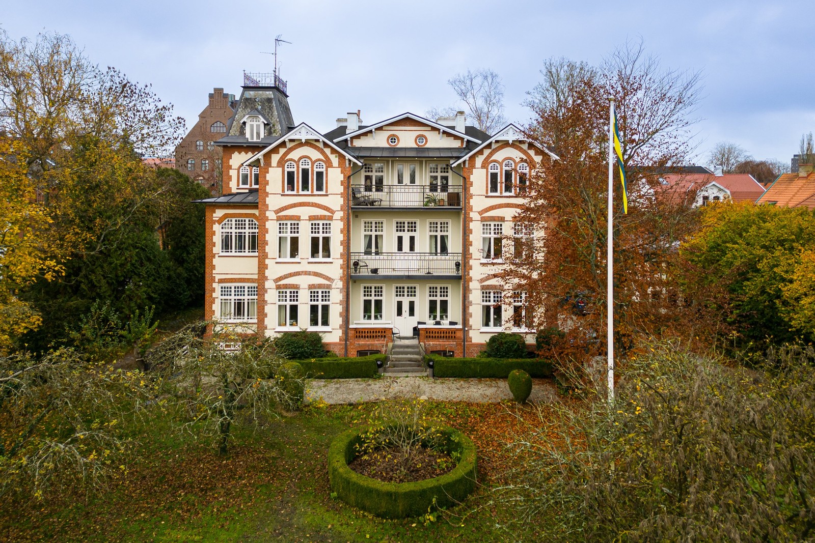 Den fridfulla Finngatan löper parallellt med Biskopsgatan, ända fram till UB-parken vars grönska skymtar 150 meter bort. Professorstadens typiska patriciervillor och stora trädgårdar kantar den nästan lite hemliga gatan. Det ståtliga jugendpalatset från 1905 tornar upp sig på gatans nummer nio, bakom höga häckar, lövträd och grönska. Den pampiga byggnaden ligger långt in på den stora tomten vilket förstärker det storslagna intrycket. Det tre våningar höga huset byggdes av kyrkoherde Cruce mellan åren 1903 och 1905. Byggnaden har en rik historia och bland tidigare boende räknas feministpionjären Hedda Andersson, chefredaktören Torgny Segerstedt samt konstnären GAN:s mor Anna. Arkitekturstilen är omisskännlig jugend med tysk inspiration. Mot Finngatan domineras gestaltningen av två höga gavelpartier som flankerar en indragen fasad med balkonger. Fasaden är vitputsad med inslag av hörnkedjor och bågar i rött tegel. Ett lekfullt torn med brant koppartak sticker upp på vänstersidan. På tornets tak skymtar en skyhög utkiksplats som tillhör denna stora våning på tredje och fjärde plan. Under utkiksplatsen finns våningens mycket speciella tornrum på plan fyra, med rundbågade fönsterpartier i tre olika väderstreck och ansenlig takhöjd. Bland de landmärken som sticker upp över innerstadens grönska och takåsar finns bland annat AF-borgen och i fjärran skymtar såväl Turning Torso som Öresundsbron. Våningen är i fint skick med bevarade eller återskapade sekelskiftesdetaljer som rika stuckaturer, takrosetter, dubbla spegeldörrar, detaljskurna listverk, två stiltrogna, kakelugnar, rundbågade fönsterpartier, höga fotlister, bröstpaneler pärlspontspaneler mm. Det stiltrogna köket och flertalet förvaringslösningar kommer från Kvänum. Mot Finngatan vänder sig tre ståtliga salonger i fil och mot gårdssidan finns två sovrum och kök. En trappa från den rymliga entréhallen leder upp till det höga tornrummet. Det centrala läget, ett par minuter från det mesta i innerstaden, kräver troligen ingen djupare argumentation.