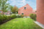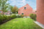 Stenlagd uteplats samt privat gräsmatta med kvällssol