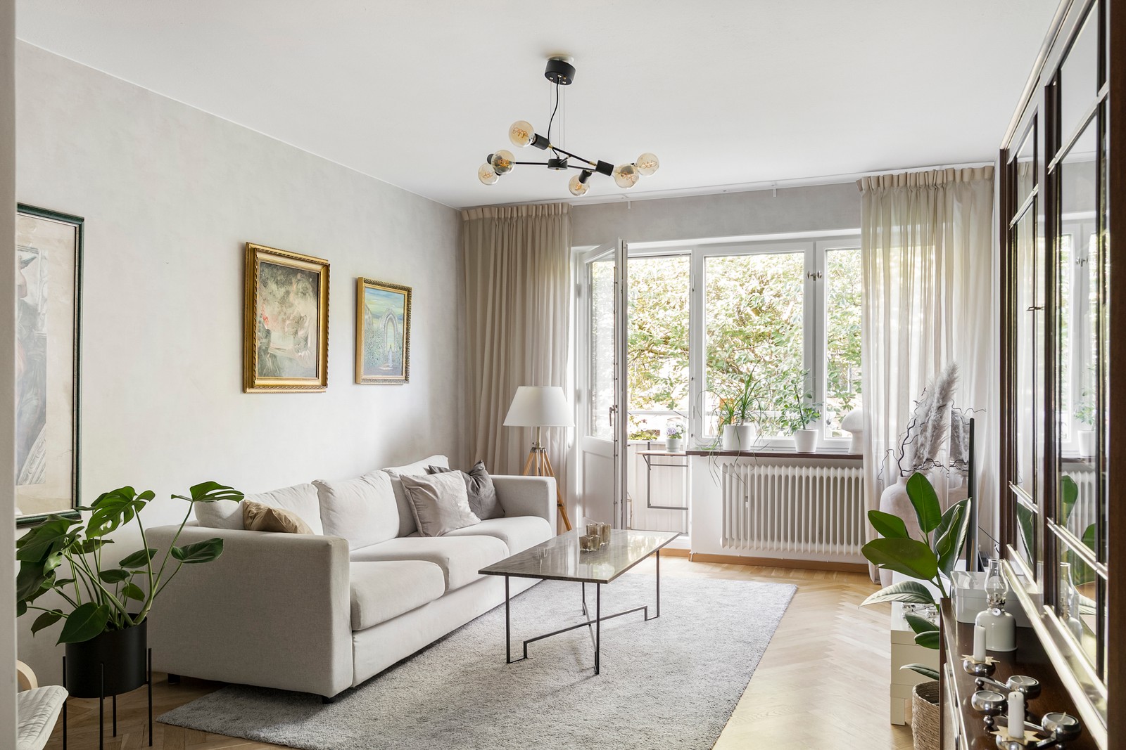 Köket är smakfullt inrett med vita luckor, svart bänkskiva och stänkskydd i blankt kakel som ger en tidlös känsla. Här finns gott om arbetsyta och plats för matbord intill fönstret, där ljuset strömmar in och skapar en härlig atmosfär. Vardagsrummet är generöst tilltaget med vacker fiskbensparkett och utgång till den västvända balkongen – perfekt för att njuta av kvällssolen bland grönskande träd. Sovrummet är rofyllt och erbjuder gott om förvaring i garderober samt egen balkong mot öster, där du kan börja dagen med en kopp kaffe i morgonsolen. Badrummet är helkaklat med moderna detaljer och dusch bakom glasväggar.