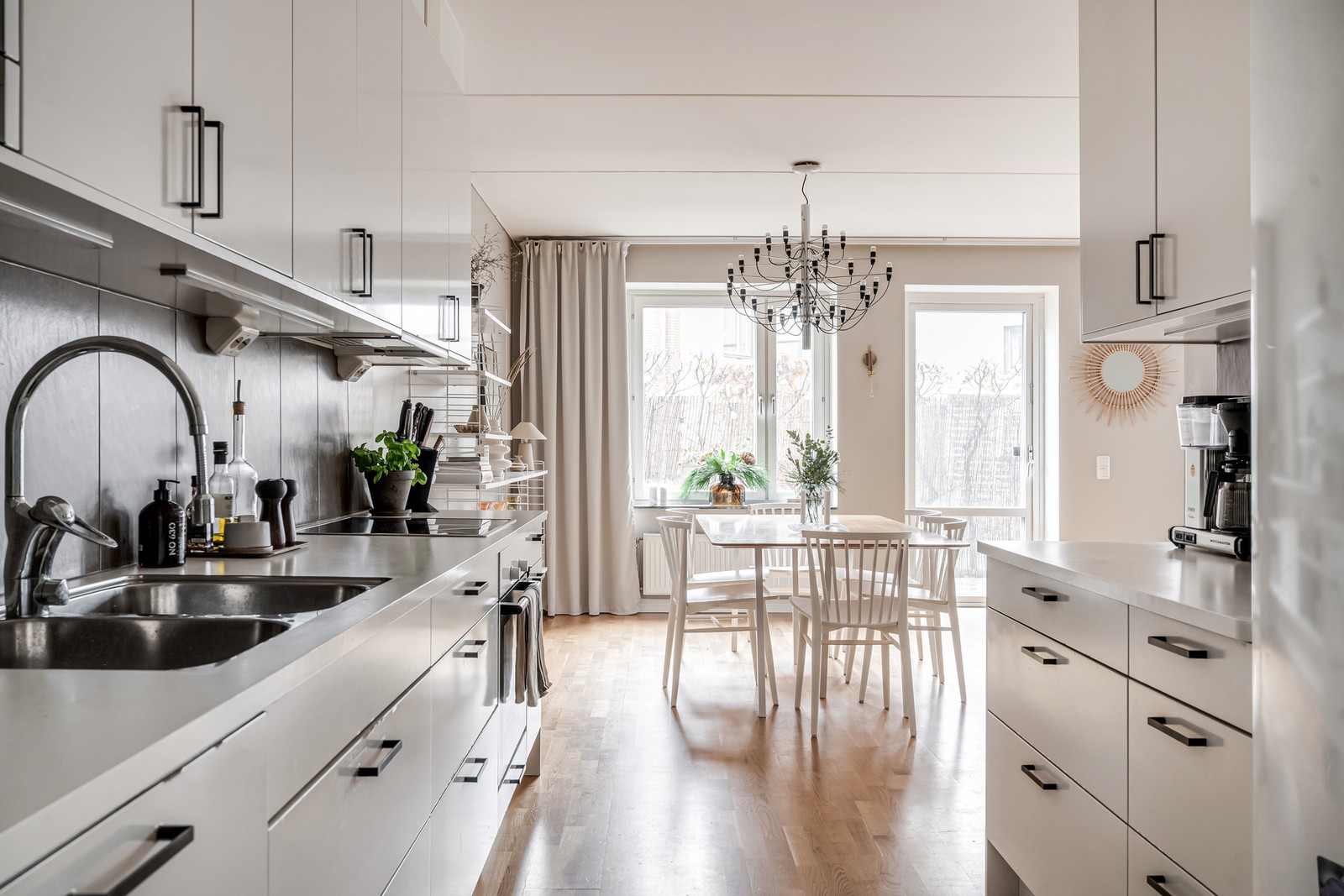 Från hallen öppnar sig det moderna och välutrustade köket. Här återfinns diskmaskin, induktionshäll, ugn och fullstor kyl samt frys i en stilren helhet, perfekt för den som uppskattar matlagning och livskvalitet i vardagen.