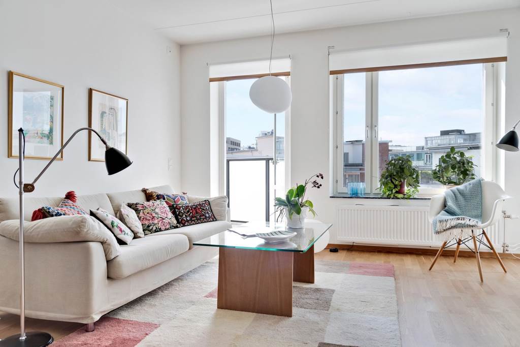 På tredje våningen välkomnas du in i en ljus och luftig hall med god förvaring bakom skjutdörrsgarderober. Här möts du av vitmålade väggar och fint ekparkettgolv i mycket gott skick, något som återkommer i hela bostaden. Planlösningen är väldisponerad med bra storlek på samtliga rum och ett generöst ljusinsläpp via stora fönsterpartier.