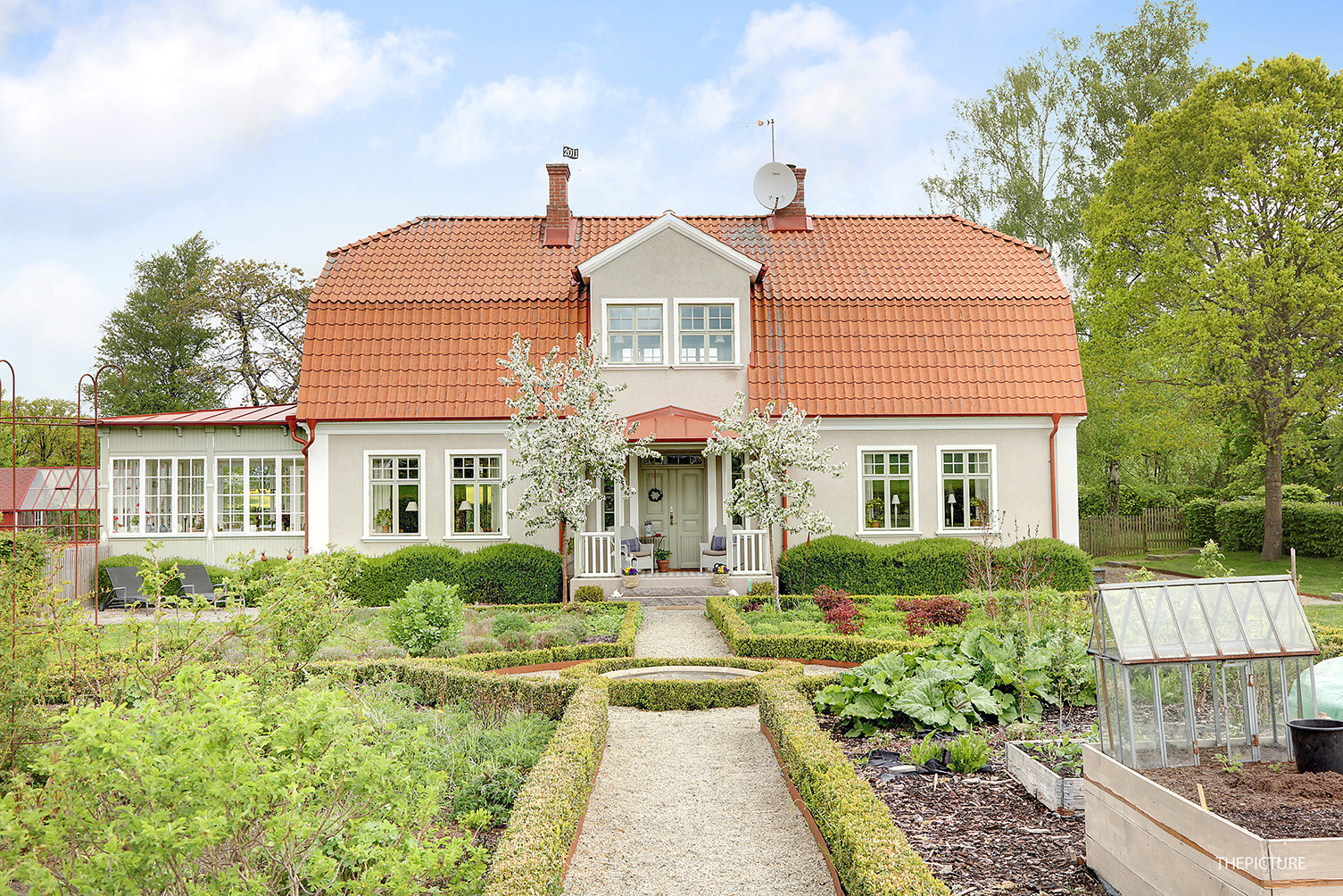 Den smala grusvägen genom fälten leder fram till huset och dess vackra omgivande planteringar. Huskroppen är pampig och för tankarna till nationalromantiska villor från förra sekelskiftet med slätputsad fasad, frontespis, farstukvist, fyllningspardörr med överljus, tvärpostfönster och valmat tak med klassiskt röda tegelpannor. Punschverandan är placerad på västra gaveln och har stående träpanel och småspröjsade glas.