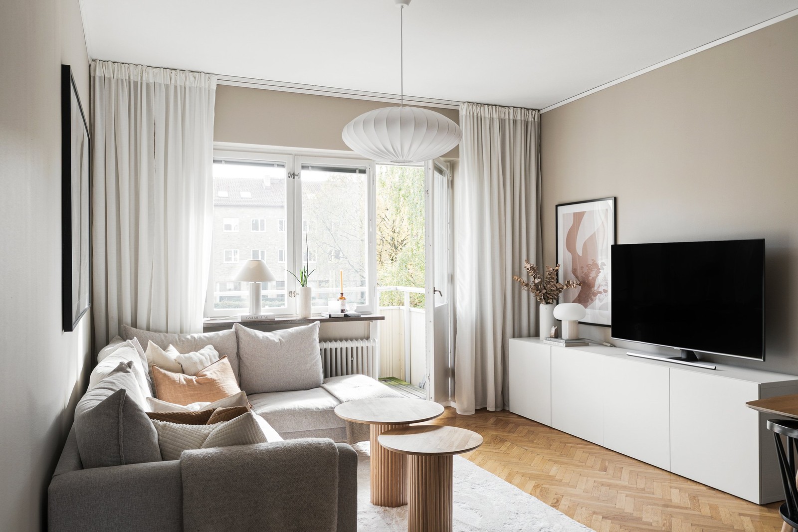 Rymligt vardagsrum med fiskbensparkett. Här med fönster och utgång till balkongen i söder. I vardagsrummet ges det plats åt både soffmöblemang och matplats. Balkongen har plats för litet möblemang med utsikt över föreningens stora och grönskande gård på ett insynsskyddat läge i söder.