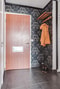 Välkomnande hall med klinkergolv och väggar målade i vitt och grått. Här finns platsbyggd garderober som erbjuder praktisk förvaring.