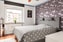 Sovrummet har laminatgolv och väggar i vitt med inslag av tapet. Här finns plats för en dubbelsäng och ytterligare förvaring.