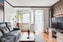 Ljust och rymligt vardagsrum med laminatgolv. Väggarna är målade i vitt, med en del tapetserad för en dekorativ touch.