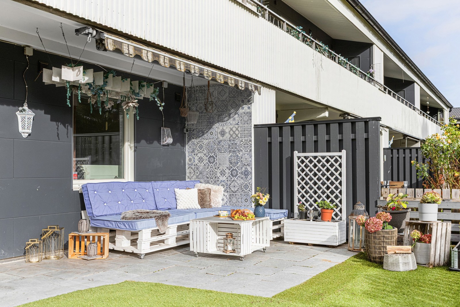 Stot uteplats i rent söderläge. Härlig grönska framför.