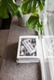 Vardagsrummet på plan tre erbjuder en enastående känsla av rymd tack vare generös takhöjd, stora originalfönster och det bevarade träpaneltaket som aldrig målats över. Golvet består av originalparkett i holländskt mönster, slipad och hårdvaxad 2019, och väggarna målades i Jotun Lady vit. Fönstren kittades delvis om och målades sommaren 2025.