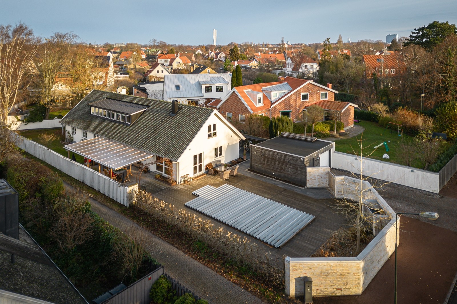 När sommarkvällens skymning faller över det fridfulla villakvarteret, och poolbelysningen får vattnet att glittra i blått, går tankarna nästan till en klassisk resort. De L-formade sällskapsytornas omfattande skjutglaspartier står på vid gavel ut till trädäcket. I pergolan under tak är långbordet dukat och matlagningen är i full gång i uteköket. Den stora villan byggdes 1968 men har i omgångar renoverats. De tidlöst rena arkitekturlinjerna är bevarade men bostaden har ytterligare öppnats för ljus och fria parkettytor. Detaljer som teakdörrar, fönsterbrädor i natursten samt fiskbensparketter möter samtida design som skjutglaspartier och braskamin. På entréplanet är planlösningen till stor del öppen med stora sällskapsytor, matsal och nyskapat kök med inredning i massiv ek och arbetsytor i kalksten och svart granit. I köket tar ett oljat betonggolv över och fortsätter in i en inre hall som förbinder till arbetsrum, master bedroom-svit, sobert badrum och groventré med tvättstuga. På övre planet finns stort allrum, tre stora sovrum, en inre hall och nyskapat badrum. Övre planets breda fönsterkupor och glaspartier skapar en ljus atmosfär även på detta plan. Bostadens förvaring är exemplarisk med flertalet formrena garderobsväggar, flera förrådsrum, walk-in-closet, originalgarderober mm.