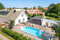 Parkera på uppfarten med handhuggen gatsten och plats för flera bilar. Dubbla träportar leder in till poolområdet där marksten i skiffer löper längs garagebyggnaden och fram till entrén på ena långsidan som ligger skyddad av träplank. Stensättningen är kantad av gatsten och grönskande planteringar.