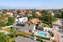 Den stora villan vänder sin vitputsade gavel under ljust tegeltak, ut mot gatan. Huset ligger långt in på tomten – grönska, träplank och en lerslammad tegelmur begränsar insynen till framsidans poolområde och det långa trädäcket.