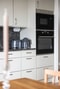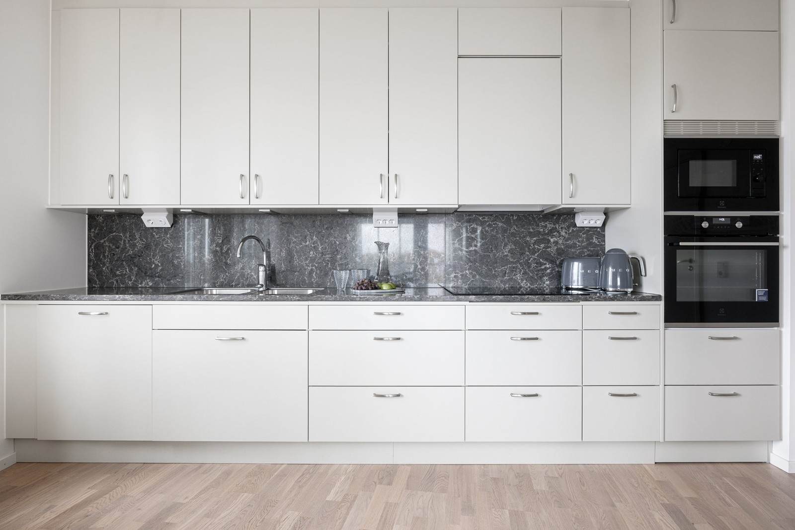 Här finns all maskinell utrustning på plats – kyl och frys, inbyggd ugn och mikro, induktionshäll med fläkt samt integrerad diskmaskin, samtliga från Electrolux i svart och rostfritt utförande. En perfekt plats för både matlagning och umgänge.